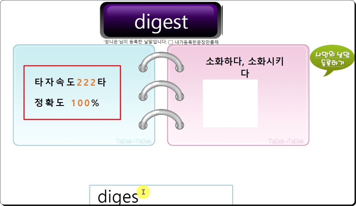 어느 정도 한글 및 영문자판을 익히셨다면 이와 같이 영어로 된 단어를 가지고 타자를 쳐보세요. 단어를 입력할 때마다 화면 좌측에 보면 타자속도와 정확도가 표시가 되는데요. 여기서 정확도를 무조건 100% 유지하는 것이 중요합니다. 이 상태에서 타자 속도는 조금씩 늘리면 돼요 앞에서도 한 번 언급했지만, 정확한 손가락 위치도 신경 써 주시길 바랍니다.