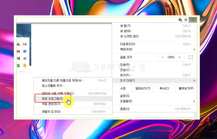 도구 더보기에는 인터넷을 할때 도움되는 것들이 메뉴들이 자리잡고 있는데요. 여기서 '확장 프로그램'을 눌러주세요.