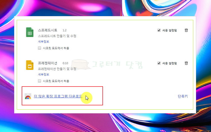 그럼 프로그램들이 주루룩 나오는데요. 맨 아래에 있는 '더 많은~ 다운로드'를 눌러주세요. 그럼 크롬의 웹스토어가 나온답니다.