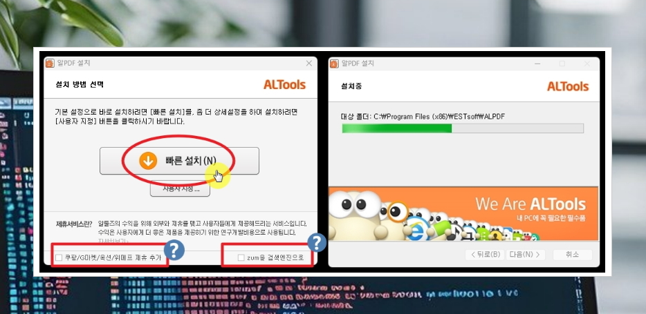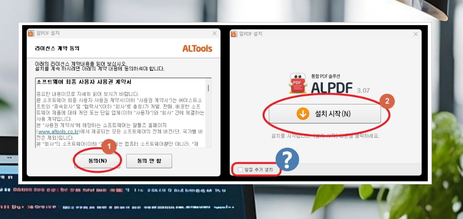 안내에 따라 [동의] 또는 [설치] 버튼을 눌러주세요. 설치를 진행할 때 알집이나 기타 소프트웨어를 함께 설치할 것인지 묻는데요. 필요에 따라 선택하면 됩니다. 필요 없으면 체크 박스를 해제해 주세요.