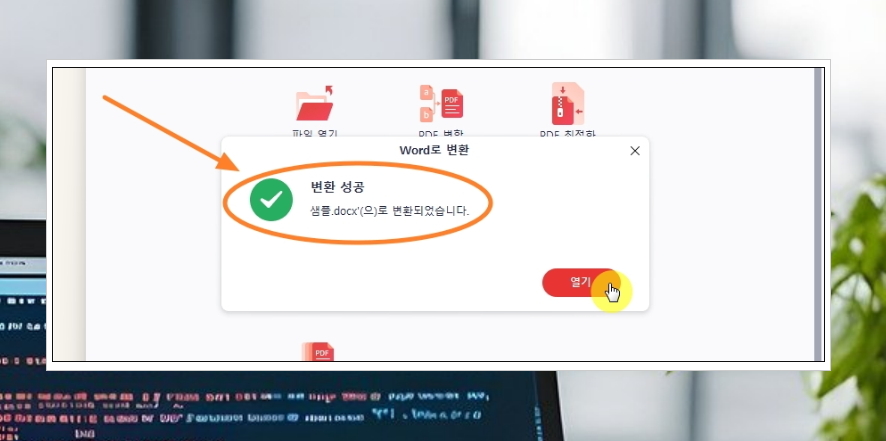 저는 마이스로소프트 오피스의 워드 문서 형식인 docx 포맷으로 바꾸어 보았는데요. 다음과 같이 "변환 성공" 문구가 나타나면서 작업이 완료 되었습니다. 프로그램 화면 중앙에 나타난 [열기] 버튼을 눌러보세요. 그럼 PDF에서 docx 파일로 바뀐 문서 파일을 열어볼 수 있습니다.