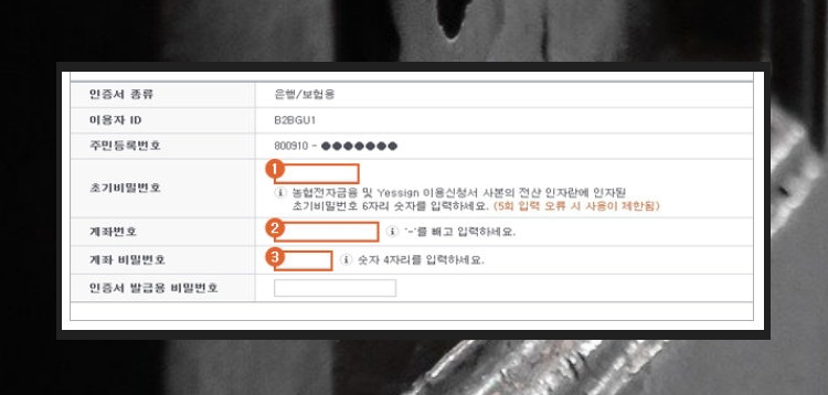 ▲ 초기비밀번호, 계좌번호, 계좌 비밀번호, 인증서 발급용 비밀번호를 순서대로 입력합니다.