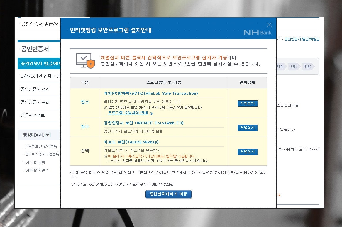 농협 사이트를 이용하려면 개인PC 방화벽, 키보드 보안, 공인인증서 보안 이렇게 3가지를 필요하네요.