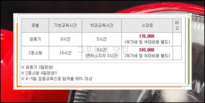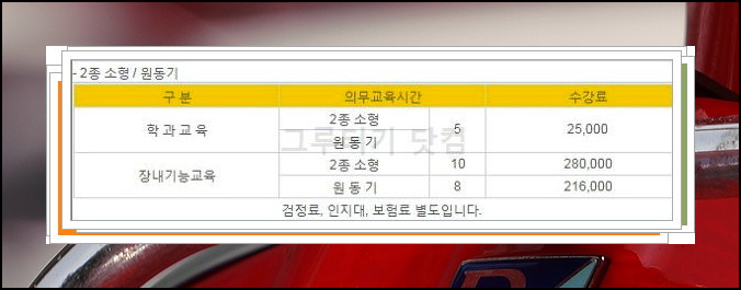 참고로 2종소형 학원비 외에 드는 비용을 일반적인 가격은 보험료 2천원, 검정료 3.3만원, 인지대 5천원정도 한답니다.