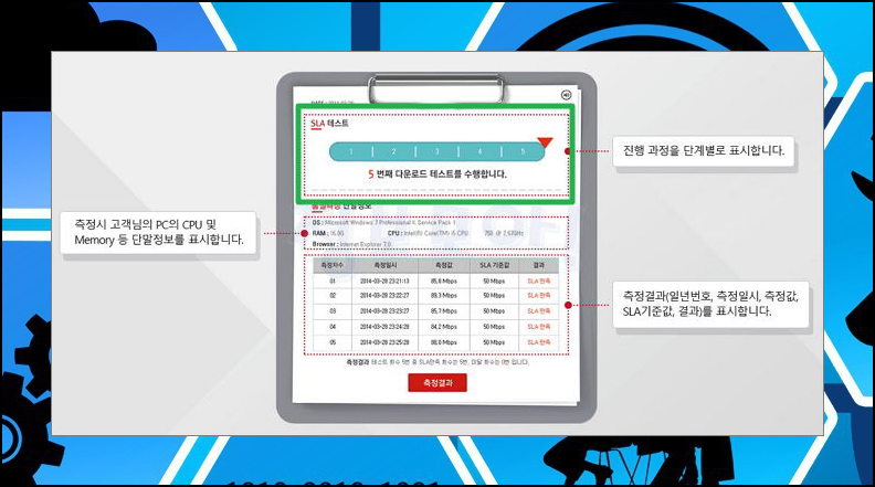 5) kt 인터넷의 품질에 대해 알아보고 싶은 경우에는 SLA 테스트를 이용하면 되는데요. kt 이용자만 사용 가능한 서비스로써 정확한 결과를 보실 수 있습니다.