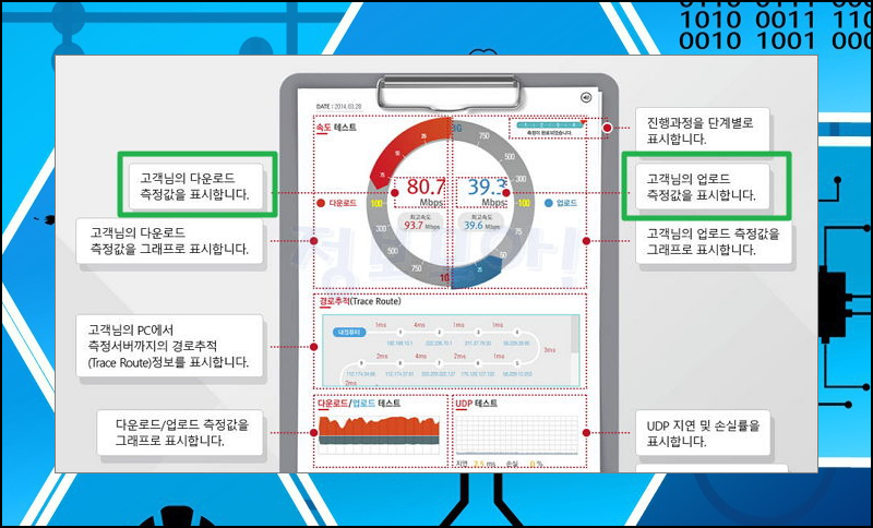 4) 속도측정 결과를 보면 다운로드 및 업로드의 속도 테스트, 경로추적, UDP 테스트, 품질측정 단말정보 등을 확인할 수 있습니다.