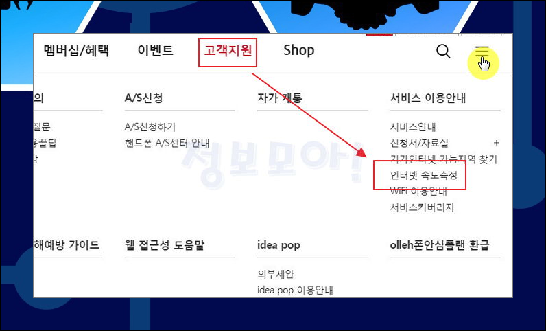2) 홈페이지에 접속하면 메뉴에서 고객지원을 찾으실 수 있을 겁니다. 맨 오른쪽에 있는 서비스 이용안내 부분에서 속도측정 메뉴를 클릭하면 돼요.