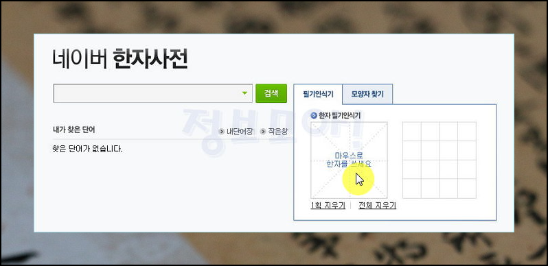한문사전 사이트에 접속하면 오른쪽에 필기 인식기가 있습니다. 여기에 마우스로 한자를 그려보세요. 스마트폰의 경우에는 손가락으로 찾고자 하는 문자를 그리면 됩니다.