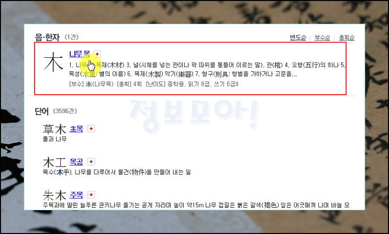 우리가 검색한 문자를 기준으로 검색된 결과를 보면 한자와 단어가 표시됩니다. 당연히 사전에 검색된 것은 1건이지만, 이 한자가 들어간 단어는 3596건으로 매우 많습니다.