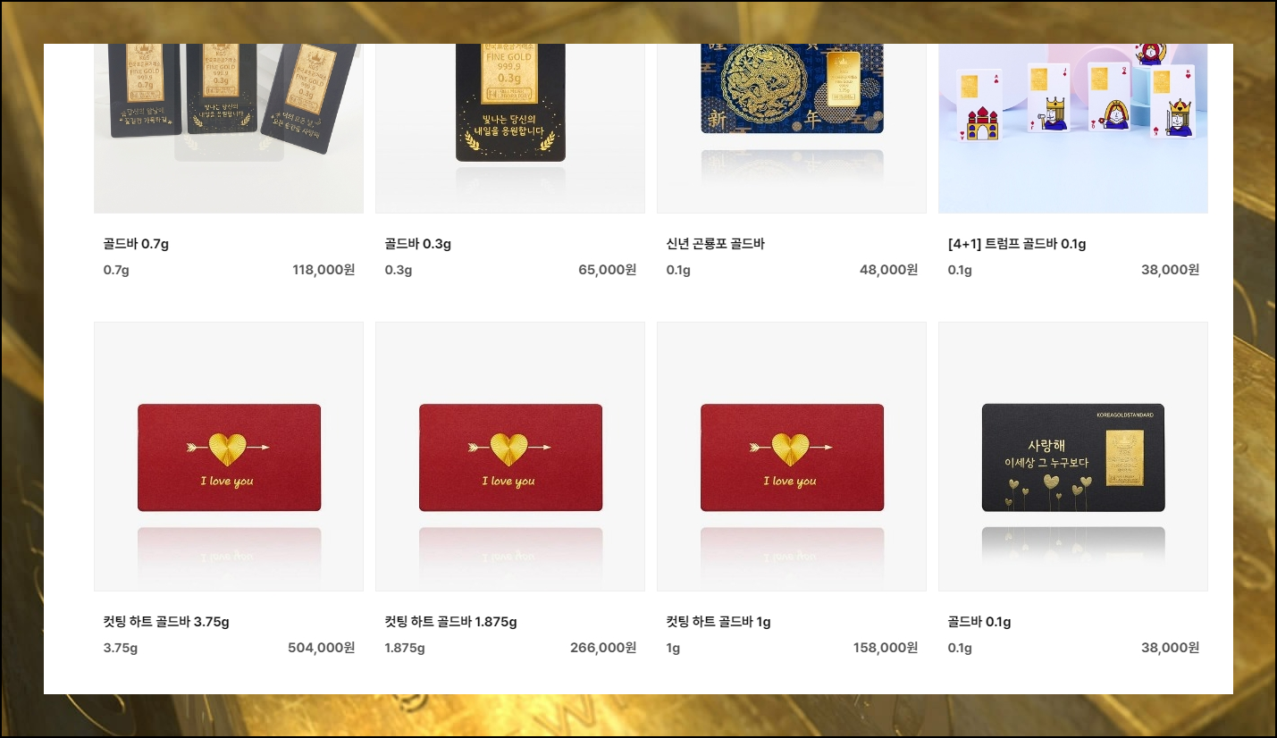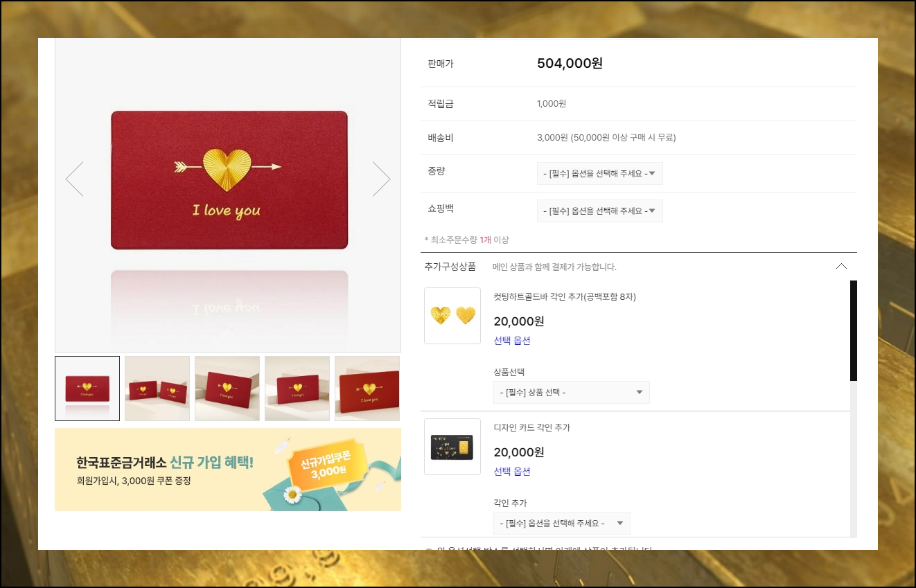 골드바를 구입할 때에는 규격, 순도, 중량을 확인할 수 있어요. 순금 1돈가격을 보면 아시겠지만, 과거에 비해 많이 올랐습니다. 구입할 때 순금만 받는 것보다는 케이스나 쇼핑백을 추가하여 선물용으로 주문할 수 있어요. 원하는 각인을 추가할 수도 있습니다. 온라인으로도 순금을 구매할 수 있어서 편해요.