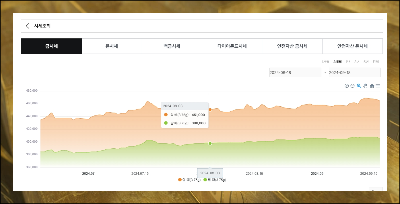 이곳에서는 단순히 순금 1돈가격을 확인하는 것에 더하여 추이를 확인할 수 있도록 그래프를 제공하고 있어요. 메뉴에서 시세 조회 버튼을 클릭해 보세요. 참고로 사이트에 접속해서 시세를 확인하는 것이 귀찮을 수 있는데요. 그런 경우에는 메뉴에 있는 [금시세문자신청] 버튼을 통해 문자로 시세 정보를 받는 서비스를 신청해 보세요. 그럼 편해요.