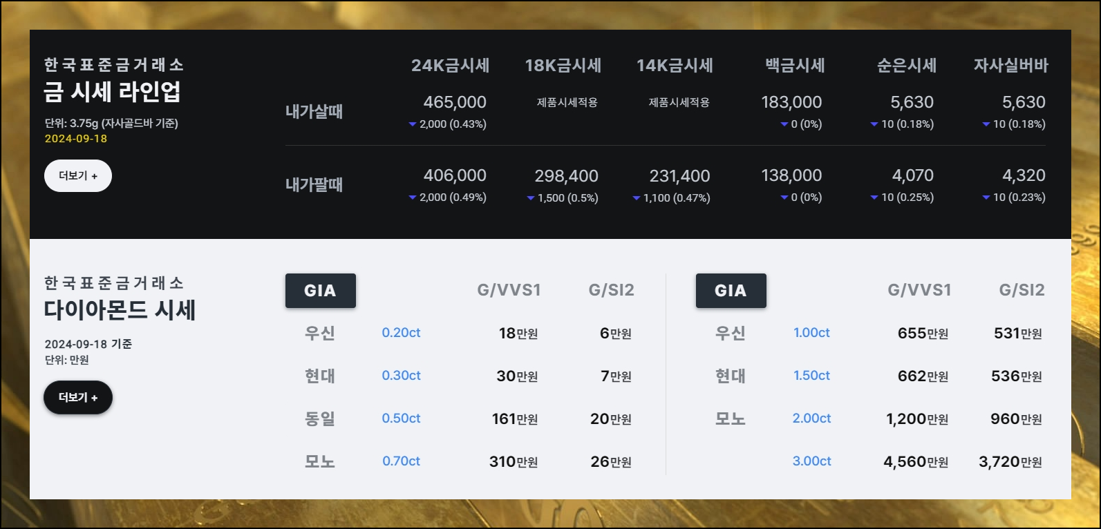 사이트에 접속하면 메인화면을 통해 바로 시세 확인이 가능해요. 오늘의 시세는 물론이고, 은과 다이아몬드에 대한 시세도 확인할 수 있는데요. 앞서 말씀 드린 바와 같이 금과 은의 경우 1돈가격 기준이에요.