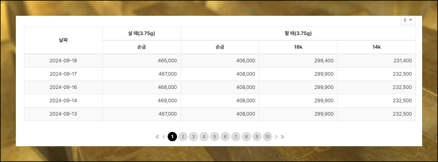 표에 나와 있듯이 우리가 순금을 살 때 책정된 것과 팔 때 책정되는 1돈가격이 달라요. 거래소를 방문하기 전에 이 부분을 미리 알고 가는 것이 좋아요. 보통 거래 수수료가 발생하기 때문에 이런 차이가 생기는 것 같아요. 집에 있는 14k 또는 18k 제품을 팔고 싶을 때 참고할 수 있는 단가표도 확인할 수 있어요.