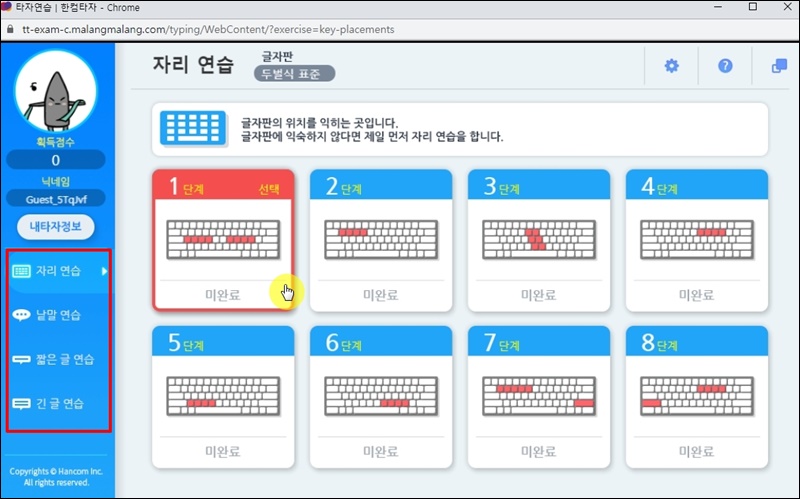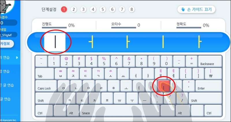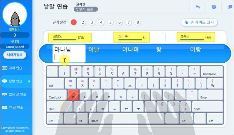 가장 먼저 자리를 익히는 것을 할 필요가 있습니다. 화면에 나온 자음 또는 모음을 보고, 키보드에 표시된 버튼을 정확한 손가락으로 클릭하면 됩니다.