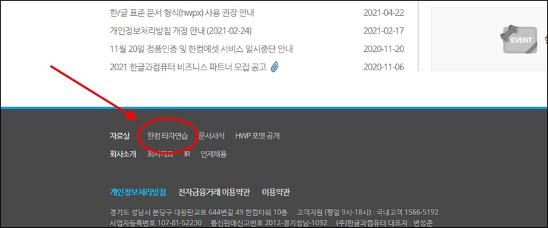 한컴 공식 홈페이지에 접속했습니다. 메인화면에서 쭉 아래로 내려가보면 자료실 카테고리가 있는데요. 여기에서 "한컴타자연습"을 클릭해 주세요. 이 외에도 여러 가지 문서서식이나 HWP 포맷을 공개 자료 다운이 가능합니다.