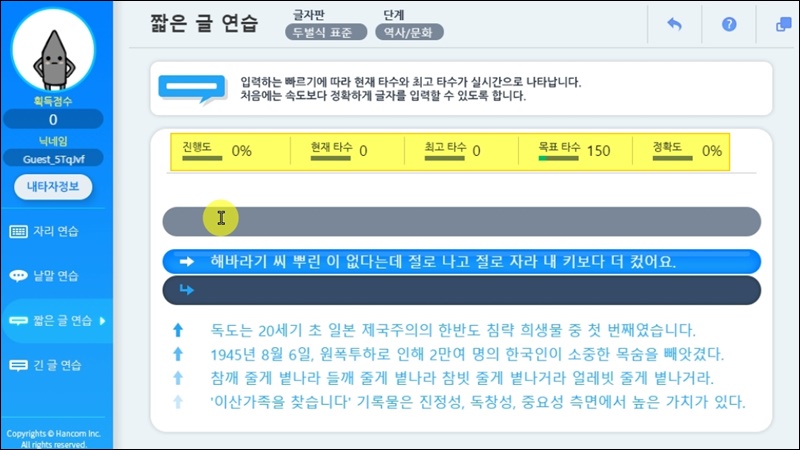 이번에는 짧은 글 연습을 할 차례입니다. 여러 개의 단어를 한 번에 입력하는 방식으로 연습을 하는 것인데요. 현재 타수, 최고 타수, 목표 타수 확인이 가능합니다.