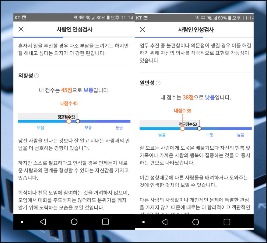 외향적인 사람들은 낯선 사람을 잘 만나기 때문에 영업에 어울리겠죠? 원만성은 조직 생활에 유리하고요. 저는 평균 또는 평균보다 낮기 때문에 홀로 일하는 것에 적합한 것 같습니다.