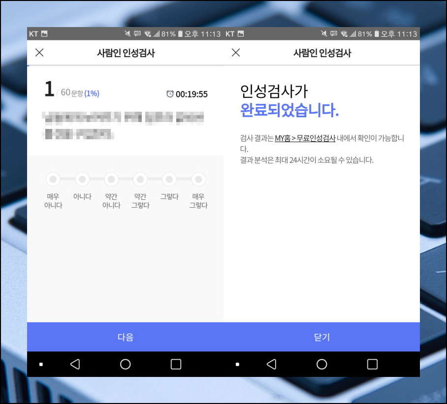 제가 직접 해보니 10분도 안 걸렸습니다. 원래 이런 검사를 볼 때에는 너무 생각을 많이 하면 안돼요. 문항을 읽고 바로 체크하시는 것이 정확한 결과 산출에 도움이 됩니다. 질문을 읽고, 매우 아니다에서 매우 그렇다까지 6개의 항목 중에 하나를 터치하면 돼요. 간단하죠?