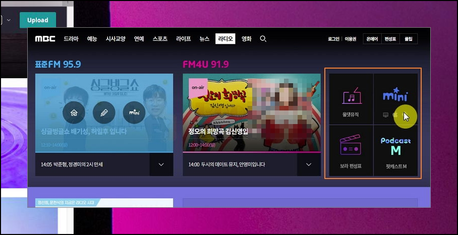 새롭게 열린 페이지를 보면 mbc의 라디오 채널를 선택할 수 있게 되어 있어요. 해당 채널을 누르면 현재 채널에서 나오고 있는 프로그램을 실시간으로 들을 수 있는데요. 화면에서 채널을 선택하거나 MINI를 클릭해 보세요. 그럼 방송 듣기 가능해요.