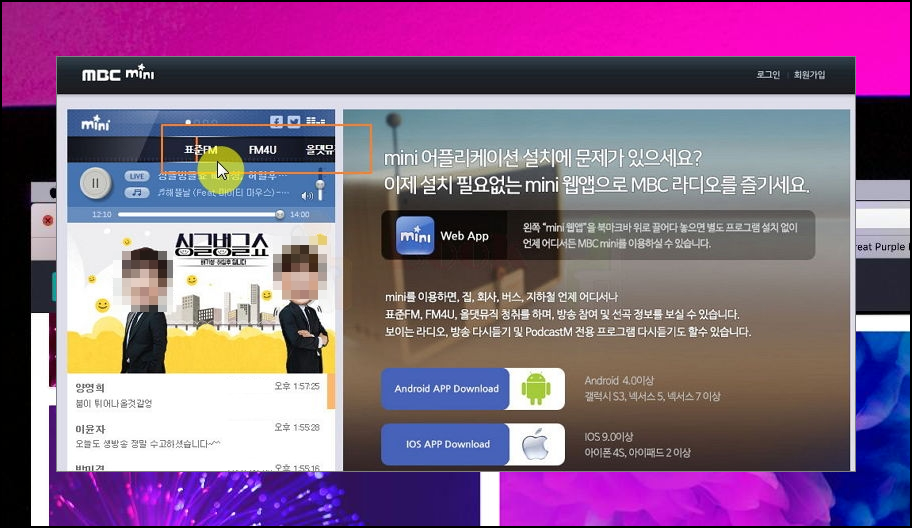 mini 페이지가 열렸어요. 좌측에 보면 음악 플레이어가 있는데요. 해당 플레이어를 통해 라디오 채널을 변경하거나 음량 조절을 할 수 있어요. 사람들이 보낸 메시지도 볼 수 있고요. 컴퓨터에 실행한 플레이어 상단에 보면 채널 이름이 있는데요. 표준FM, FM4U 외에 올댓뮤직이나 팟캐스트도 들을 수 있어요. 노래만 듣기 원하는 분들은 올댓뮤직 채널을 추천 드려요.