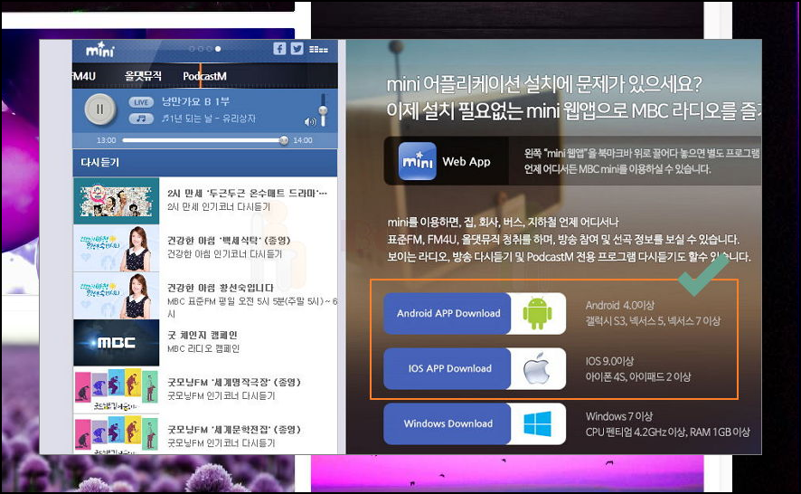 아이폰의 경우 앱스토어를 실행한 후 mini 플레어를 검색하면 찾을 수 있어요. 해당 앱을 설치하면 컴퓨터를 이용하지 않고도, 라디오 듣기 가능하오니 참고해 주세요.