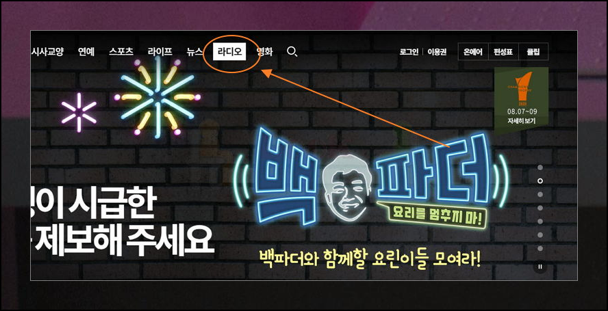 컴퓨터로 mbc 공식 홈페이지에 접속하면 여러 가지 방송 프로그램에 관련된 서비스 메뉴를 만나볼 수 있을 거에요. 시사교양, 라이프, 뉴스, 영화 등 다양한데요. 여기에 더하여 티비 방송을 볼 수 있는 온에어 서비스도 제공하고 있어요. 해당 사이트를 통해 컴퓨터로 라디오 듣기를 하고 싶다면 메뉴에 있는 [라디오]를 클릭하면 돼요.