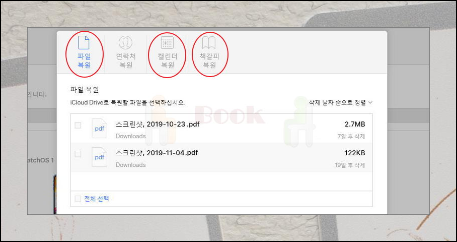 삭제된 파일도 복원이 가능해요. 그 밖에 캘린더나 책발피도 복원이 가능해요. 사용법을 따로 익힐 필요 없어요. 복원 버튼만 누르면 되니까요.