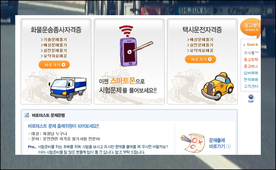 메인 화면의 다양한 메뉴 중에서 화물운송종사 자격시험 준비를 위해서는 최우측에 위치한 바로테스트 메뉴를 선택하시면 됩니다. 직관적인 구성으로 원하는 자료를 쉽게 찾을 수 있어요. 처음 방문하시는 분들도 어려움 없이 필요한 정보에 접근할 수 있도록 설계되어 있습니다.