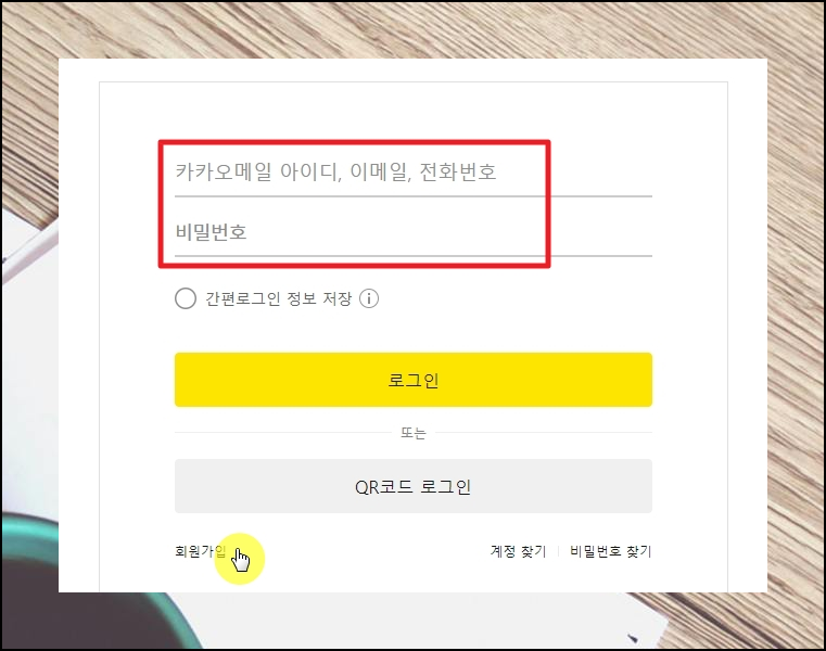 서비스 이용을 위해서는 기존 카카오톡 계정(주소)으로 로그인하시면 되는데요. 만약 카카오톡을 사용하지 않으신다면 걱정하지 마세요. 회원가입 버튼을 통해 상세한 가이드 영상을 확인할 수 있으니 천천히 따라하시면 됩니다.