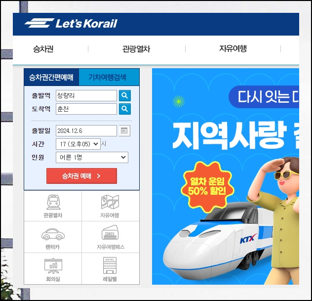 기차 예매는 레츠코레일 웹사이트를 통해 진행하시면 되는데요. 단순히 예매뿐만 아니라 철도 관련 행사와 유용한 정보들도 얻을 수 있습니다. 예매 시에는 청량리역을 출발지로 설정하고 시간표를 확인한 뒤 목적지를 선택해 주시면 됩니다.