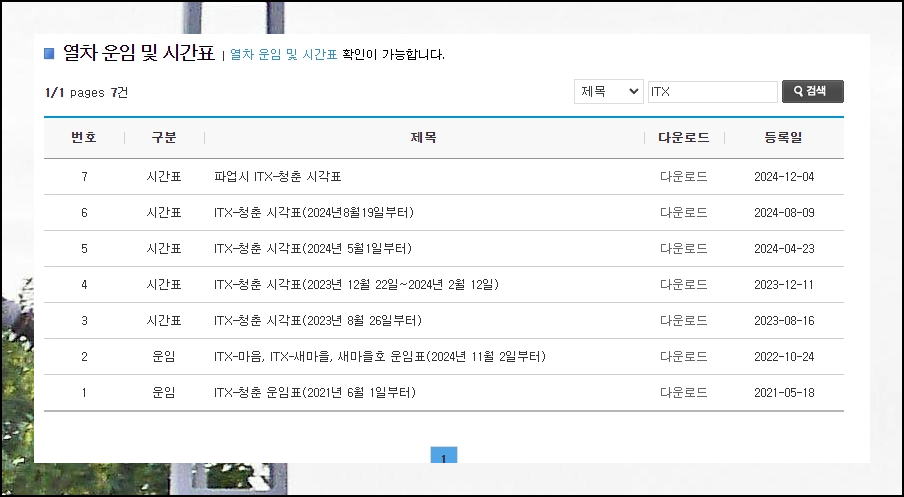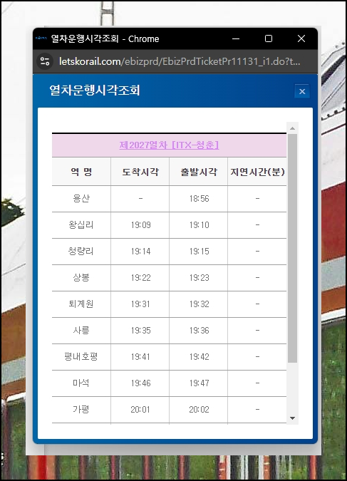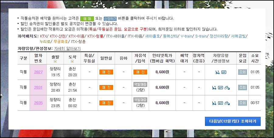 청량리역 기차시간표 운임 조회 (최신)