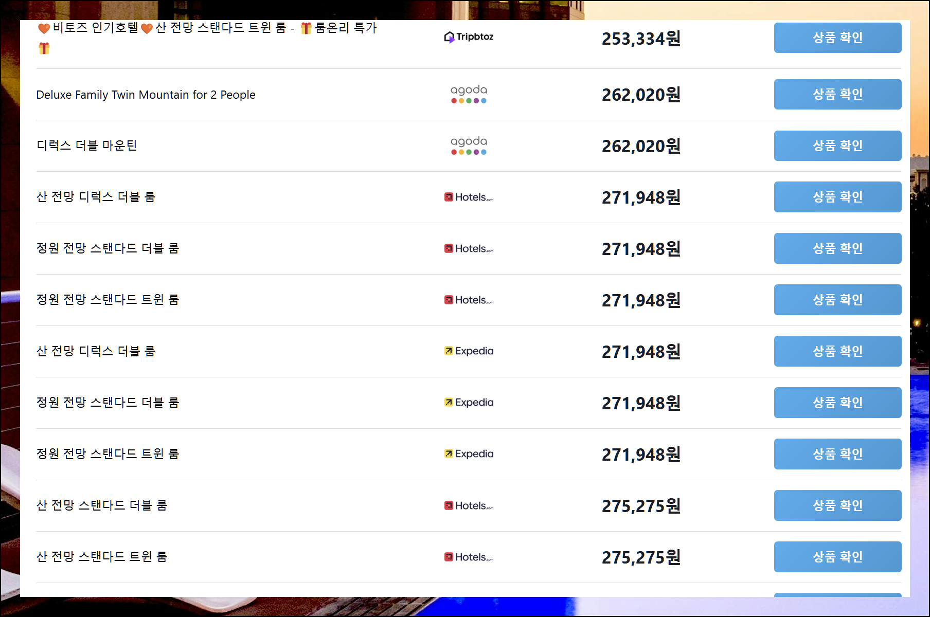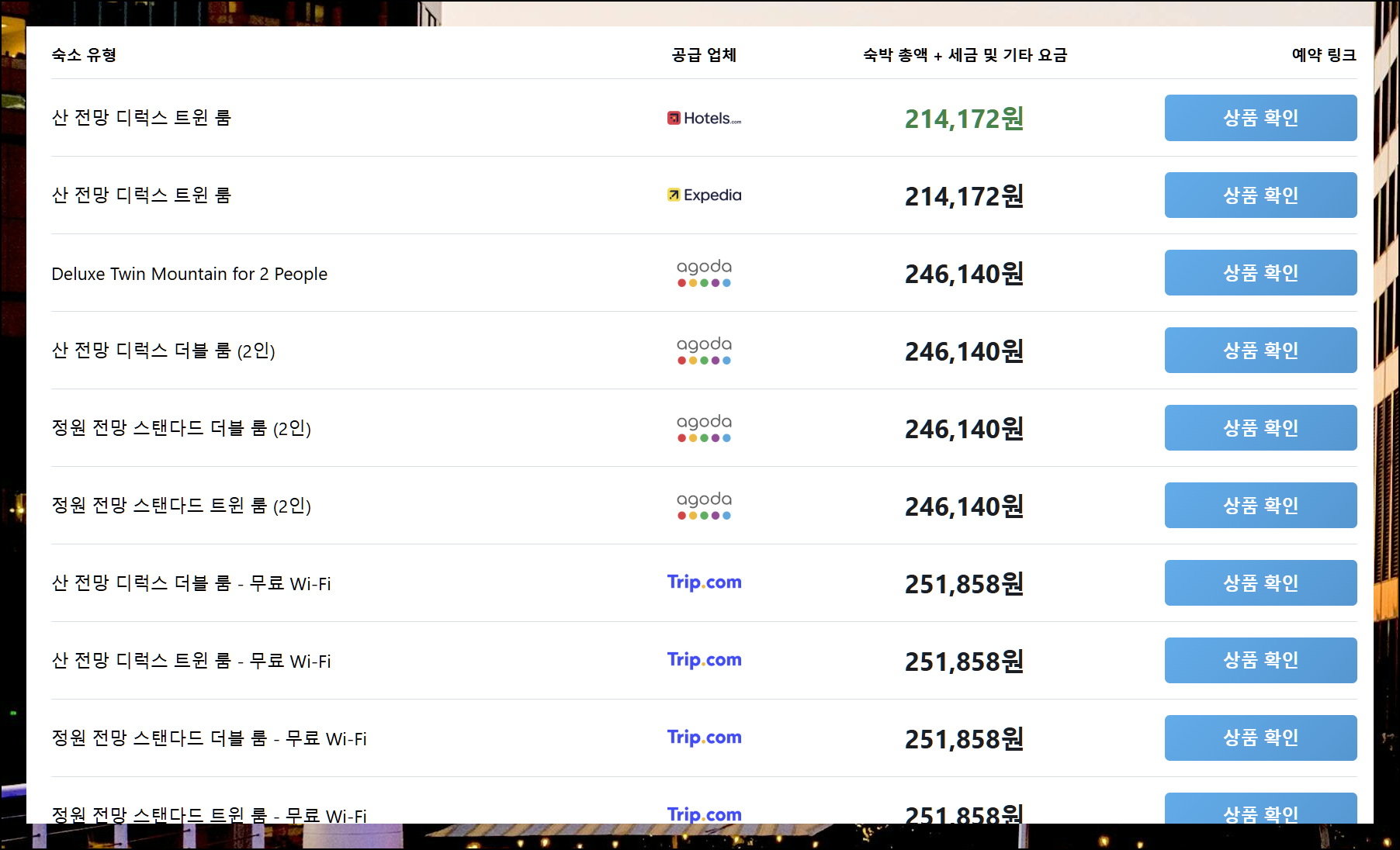 여러 사이트의 객실 정보와 가격을 비교할 수 있어요. 국내 숙박 예약 시 최적의 조건을 찾을 수 있습니다. 할인 혜택도 꼼꼼히 살펴보세요.