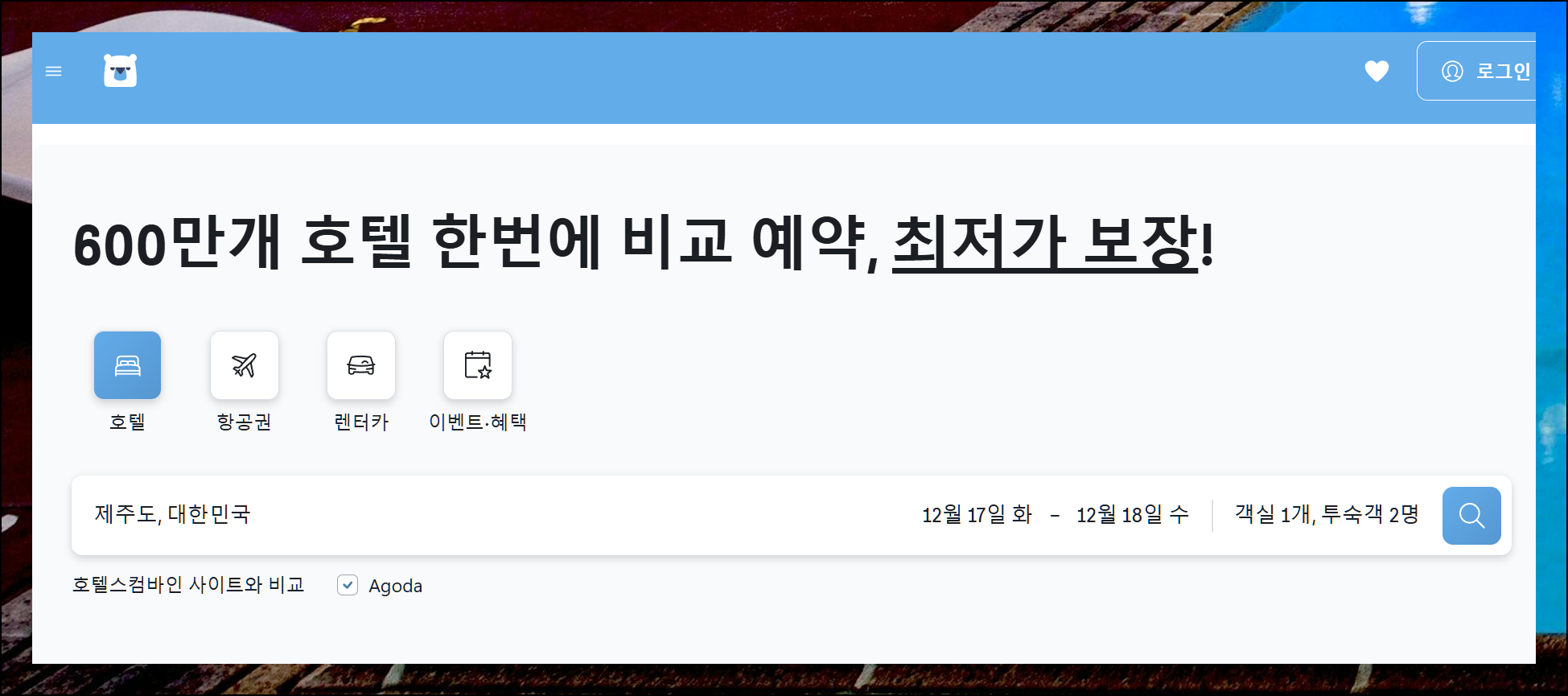 사이트에 접속하면 목적지와 일정을 선택하게 됩니다. 제주도나 서울같은 국내 인기 여행지가 상위권에 있어요. 숙박시설 검색 시 원하는 지역의 상세 정보도 확인할 수 있습니다.