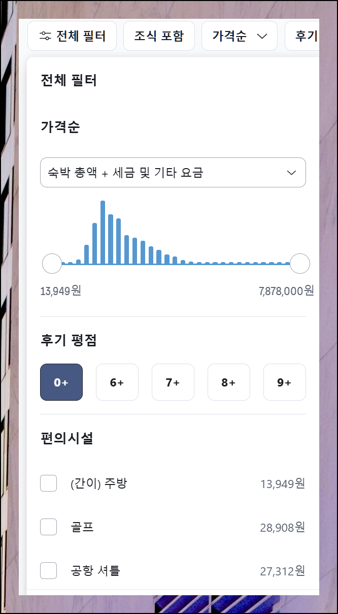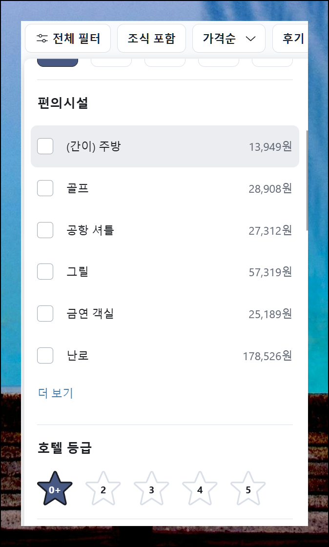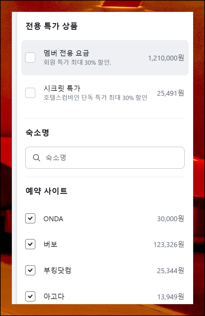 화면 좌측의 필터를 활용하면 특가 숙박 상품을 쉽게 찾을 수 있어요. 예약사이트마다 제공하는 할인 혜택도 한눈에 비교 가능합니다. 국내 특가 상품을 효율적으로 검색해보세요.