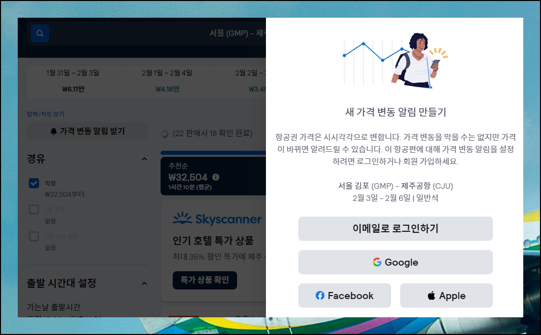 원하는 가격대를 찾지 못했나요. 가격 변동 알림 서비스를 설정해보세요. 출발일이 다가올수록 땡처리 항공권이 늘어나는 경향이 있어요. 알림 서비스로 특가 기회를 놓치지 마세요. 원하는 노선의 예약 가능 여부도 바로 확인할 수 있습니다.