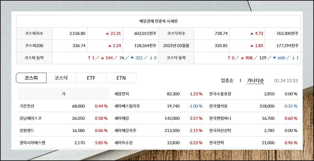 실시간으로 업데이트되는 매일경제 전종목 시세 서비스는 필수 도구라고 할 수 있어요. 우리가 다루는 주식에 대하여 현재가와 등락폭을 즉시 확인할 수 있기 때문이죠. 코스피200과 선물시장 정보도 함께 제공하고 있으니 활용해 보시길 바랍니다. 증권시세를 조회하기 위한 많은 기능이 준비되어 있습니다.