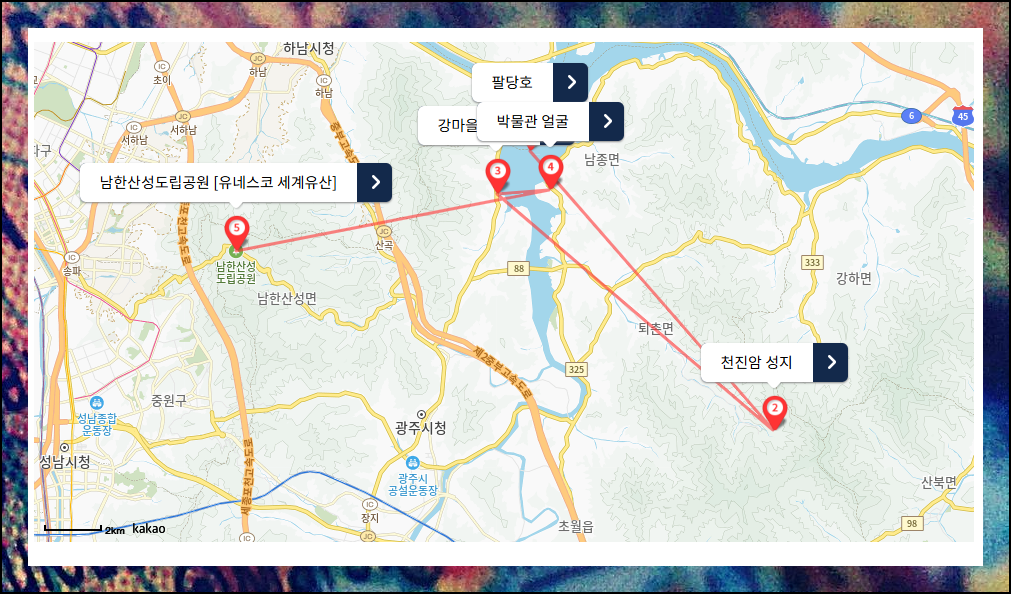 맵 기능으로 코스 여행지 위치를 쉽게 확인할 수 있습니다. 남한산성도립공원, 팔당호, 강마을 다람쥐, 천진암 성지 등 코스로 짜여져 있는 명소들이기 때문에 묶어서 하루 일정으로 다녀오기에 정말 좋아요.