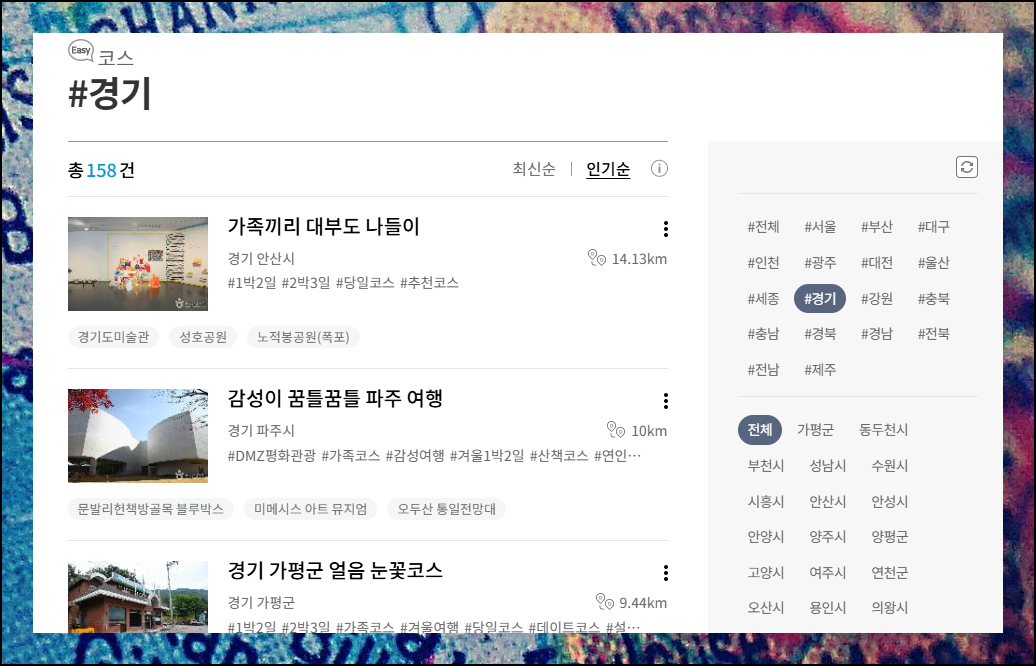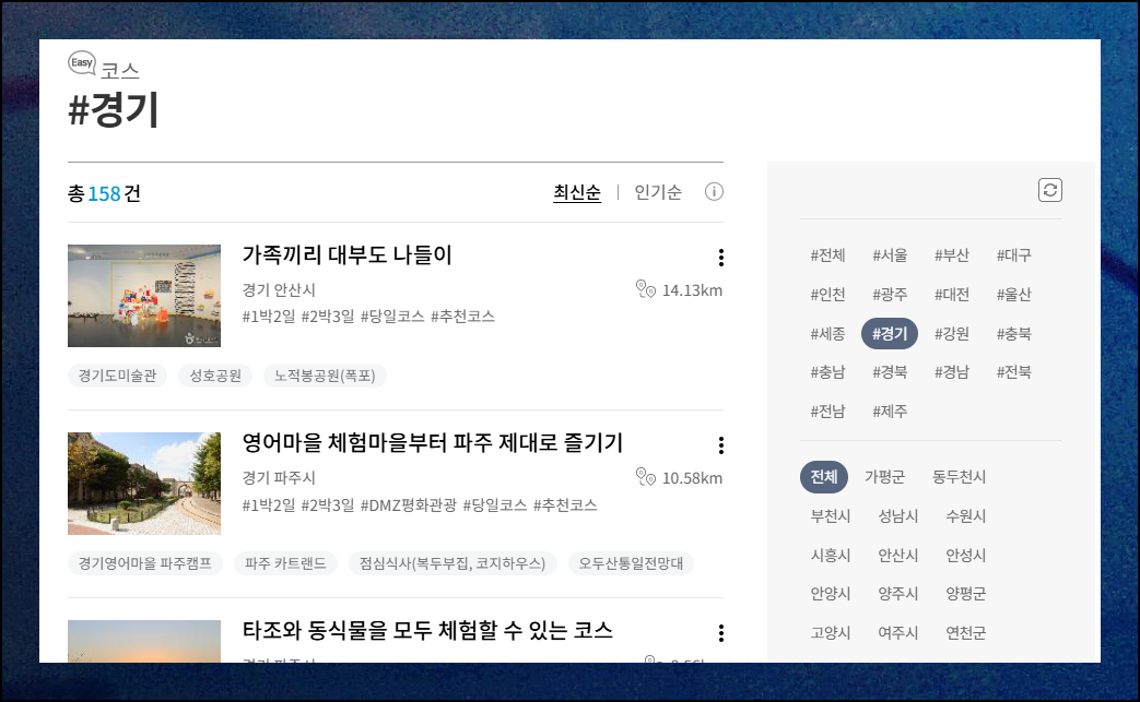 경기도에는 당일여행으로 다녀오기 좋은 코스가 158개나 있어요. 각 스팟마다 현재 위치에서의 거리(km)가 표시되어 있어 서울근교 나들이 가능 여부를 쉽게 판단할 수 있습니다. 특히 주말 데이트로 갈만한곳들도 많이 있습니다.