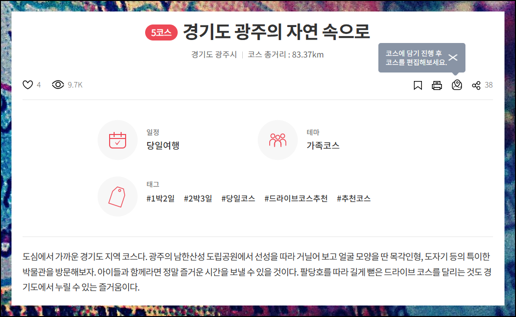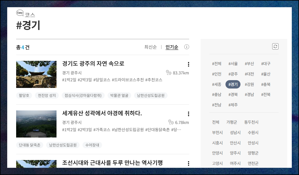 여러 곳을 연계해서 탐방하면 더욱 풍성한 경험이 됩니다. '대한민국 구석구석'에서는 서울근교 당일치기 여행 루트도 추천해드려요. 코스별 총 이동거리를 체크하면 소요시간도 예측 가능하니 갈만한곳들을 효과적으로 둘러볼 수 있어요.