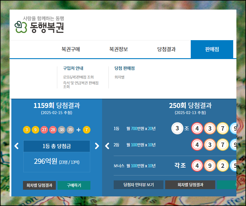 동행복권 플랫폼은 로또뿐만 아니라 연금복권, 스피또 당첨 안내도 제공해요. 로또 1등 판매처를 알아보려면 지역이나 상호를 입력하면 됩니다. 별도 입력이 없으면 최근 발표된 회차 내용이 자동으로 표시되니 참고해주세요.