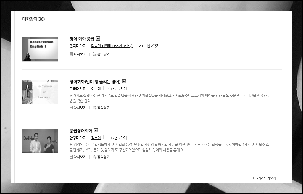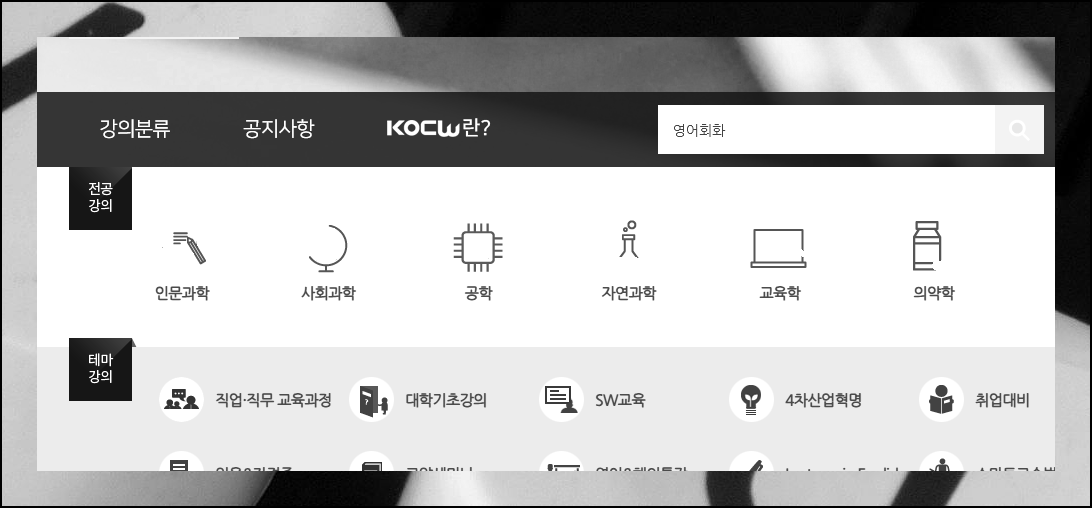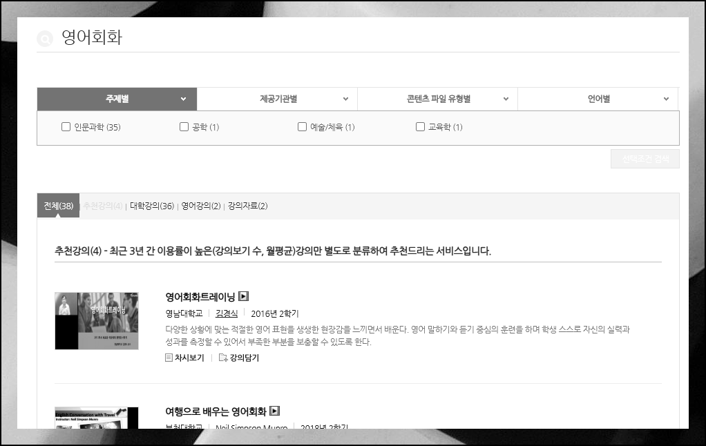 각 대학에서 진행하는 고품질 교육을 집에서 무료로 들을 수 있어요. 검색창에 '영어회화'를 입력하기만 하면 다양한 수준과 스타일의 강의들이 나타나는데요. 여기에서 원하는 학습 자료를 쉽게 찾을 수 있습니다.