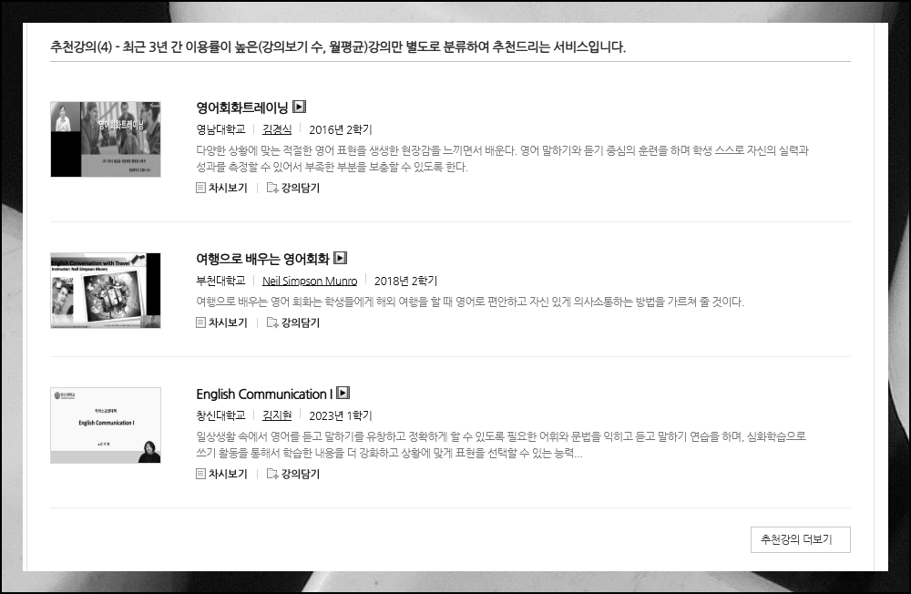 처음이라 어떤 수업을 들어야 할지 망설여진다면, 추천 강좌 섹션을 먼저 확인해보세요. 최근 3년간 많은 사람들이 선택한 인기 영어회화 프로그램들이 모여 있어서 품질이 검증된 학습 자료를 쉽게 찾을 수 있어요.
