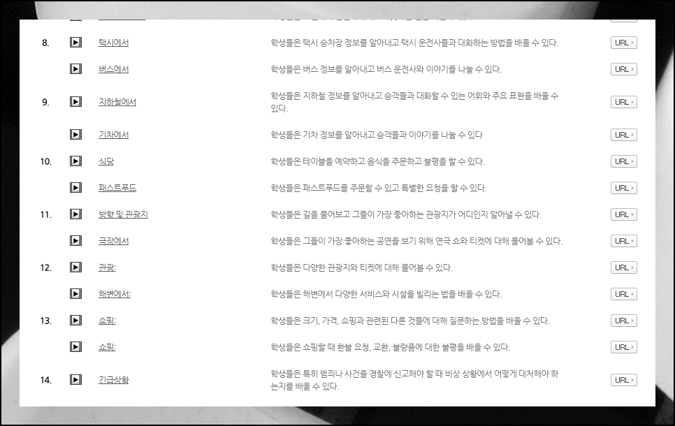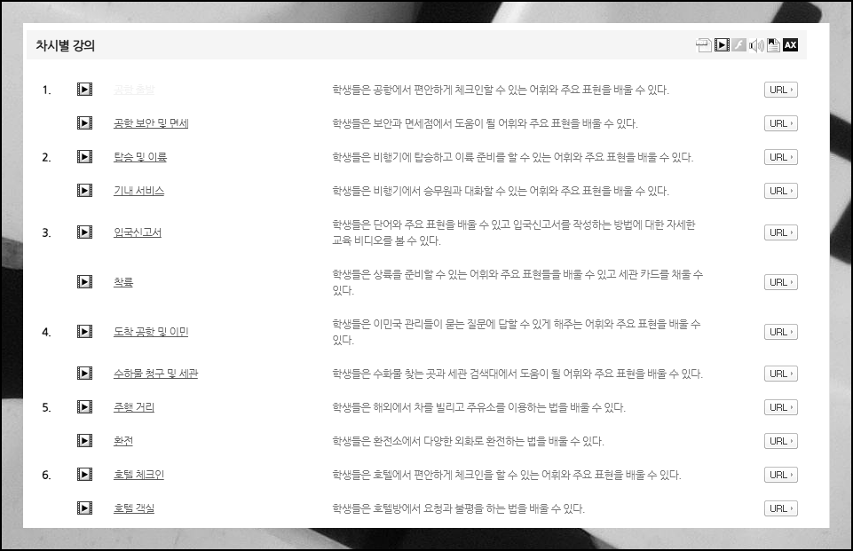 실제 대학 수업처럼 교육 계획서 열람이 가능하고, 차시별 강좌 목록도 확인할 수 있어요. 원하는 주제나 난이도의 영어 프로그램만 선택적으로 수강할 수 있어 효율적인 학습이 가능합니다. URL 복사 기능으로 좋은 회화 강의를 친구나 가족에게 쉽게 공유할 수 있으니 함께 배우는 것도 가능해요. 이 학습 사이트를 통해 꾸준히 노력한다면 영어회화 능력이 놀랍게 향상될 것입니다.