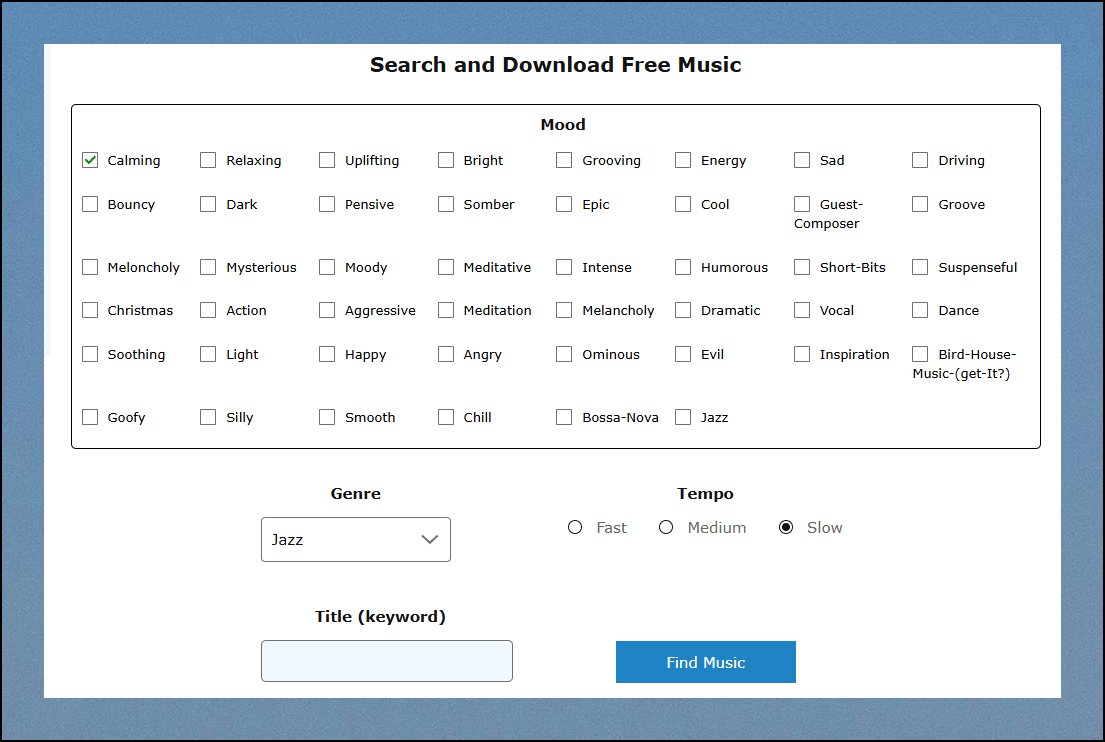 이 사이트는 다양한 분위기의 콘텐츠를 제공해요. 무드, 템포, 장르별로 원하는 옵션을 선택하면 나에게 맞는 명상 사운드를 찾을 수 있습니다. 명상 세션을 위한 음악을 찾고 있다면 Calming이나 Relaxing 항목을 체크하고 [Find Music] 버튼을 클릭해 보세요. 자신의 기분과 상황에 맞는 명상 멜로디를 선택하는 것이 효과를 높이는 비결이에요. 무료로 제공되는 다양한 선율들을 들어보며 자신에게 가장 적합한 음악을 발견해보세요.
