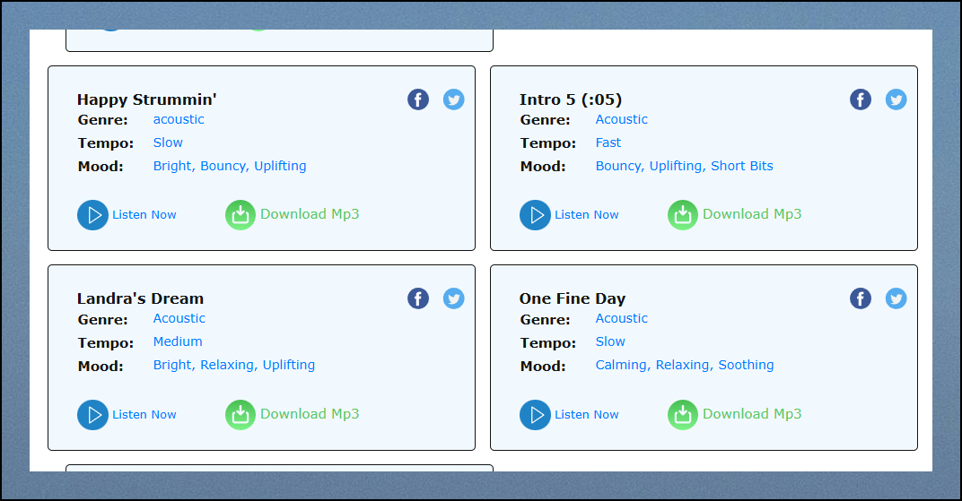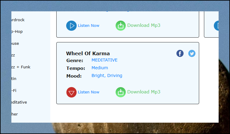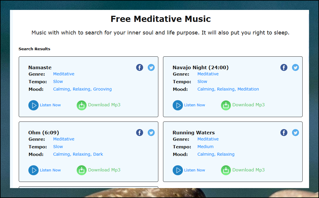 페이지에 접속하면 [Listen Now] 버튼만 클릭해서 바로 음악듣기 할 수 있어요. 각 곡마다 제목, 장르, 템포, 분위기 정보가 표시되어 있습니다. 마음이 불안하거나 긴장된 상태라면 Tempo가 Slow이고 Mood가 Relaxing인 트랙을 선택하세요. 온라인 접속이 어려운 상황에서는 [Download Mp3] 버튼으로 컴퓨터에 저장해 명상음악을 무료 다운로드 받아 언제든 듣기 가능해요.
