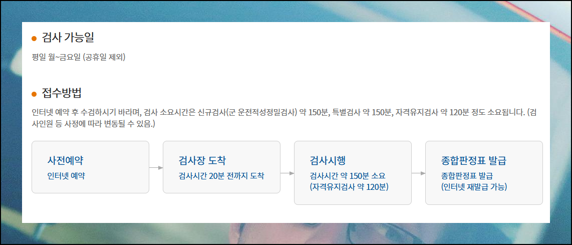 자격유지검사 신청은 온라인으로 예약하여 진행할 수 있어요. 전체 절차는 인터넷 예약 후 검사일에 지정된 장소로 예정 시간 20분 전까지 도착하면 됩니다. 미리 방문하면 접수와 서류 확인 등의 사전 단계를 여유롭게 진행할 수 있어 당일 평가가 더욱 원활하게 진행됩니다.