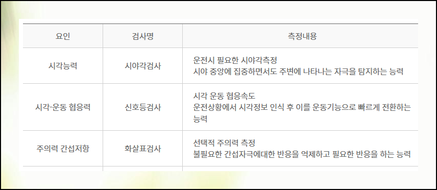 운전자격유지검사에서는 어떤 능력을 측정하는지 미리 파악하면 도움이 됩니다. 측정 항목 중 3가지는 시야각 확인, 신호등 변화 반응 시간, 좌우 방향 선택 능력 테스트로 구성되어 있어요. 이런 기술들은 실제 도로에서 안전 주행을 위한 판단을 내리는 데 필수적인 요소들입니다.