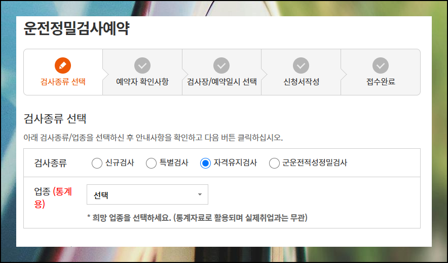 "운전정밀검사예약" 메뉴를 선택하면 테스트 종류와 업종 선택 화면이 표시됩니다. 희망하는 장소와 날짜를 선택한 후 신청서 양식을 작성하면 예약이 완료됩니다. 각 단계는 간단한 정보 입력만으로 진행되므로 컴퓨터에 익숙하지 않은 분들도 어렵지 않게 신청이 가능해요. 예약 완료 후에는 혹시 모르니 예약 내용을 한번 더 확인해보세요.