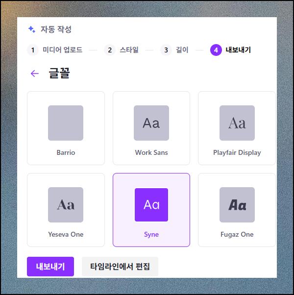 음향이 없으면 정적인 장면만으로는 시청자의 관심을 유지하기 어렵거든요. 사운드 선택 후에는 텍스트 글꼴도 지정할 수 있습니다. 원하는 느낌으로 설정한 다음 '내보내기' 버튼을 누르세요.