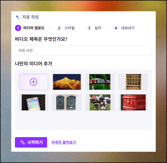 저는 동물 테마의 사진들을 선택했어요. 모든 파일 추가가 끝나면 '시작하기' 버튼을 눌러 다음으로 진행합니다. 소재 선택이 중요하니 일관된 테마로 준비해보세요.